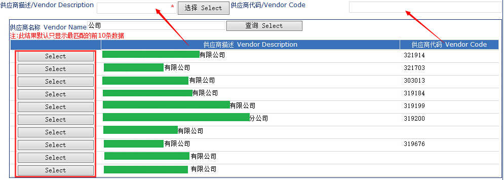 如图,我正做一个操作————以公司为关键词点击查询进行模糊查询,找到10条信息,点击左边的Select按钮,将会把供应商描述和供应商代码一并带出并赋值给最上面的两个文本框。