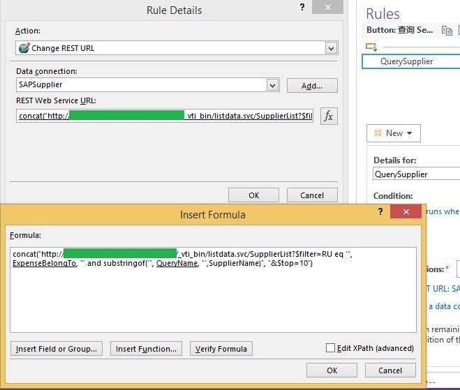 刚开始做时,遇到一个尴尬的问题。供应商信息保存在一个SPList里,RepeatTable控件可以绑定这个SPList数据源,但是要对数据源进行筛选,只能通过给QueryFields赋值的方式,这样就意味着模糊筛选行不通,只好想办法绕路了。