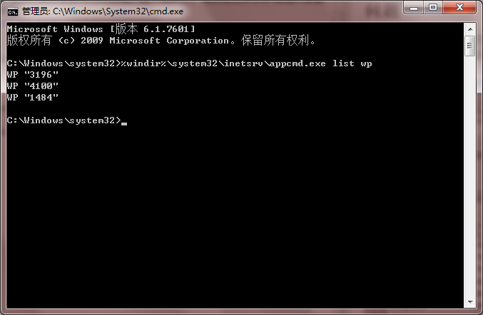 脚本命令: %windir%\system32\inetsrv\appcmd.exe list wp